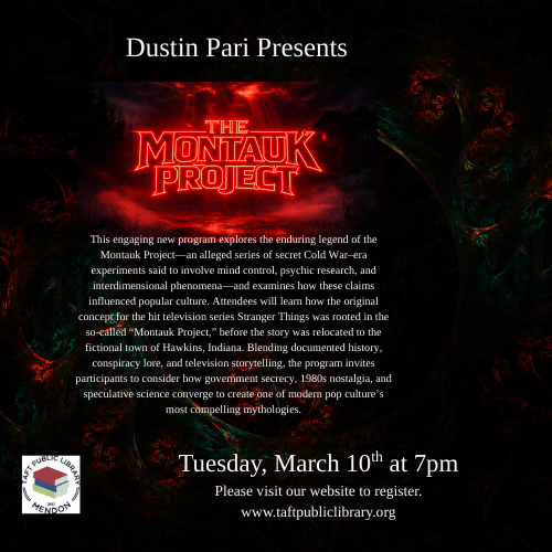 This engaging new program explores the enduring legend of the Montauk Project—an alleged series of secret Cold War–era experiments said to involve mind control, psychic research, and interdimensional phenomena—and examines how these claims influenced popular culture. Attendees will learn how the original concept for the hit television series Stranger Things was rooted in the so-called “Montauk Project,” before the story was relocated to the fictional town of Hawkins, Indiana. Blending documented history, conspiracy lore, and television storytelling, the program invites participants to consider how government secrecy, 1980s nostalgia, and speculative science converge to create one of modern pop culture’s most compelling mythologies.